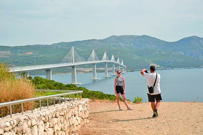 由中国路桥公司牵头的中国企业联合体承建的克罗地亚佩列沙茨大桥7月26日迎来通车三周年。图为当日游客在佩列沙茨大桥附近拍照。新华社发