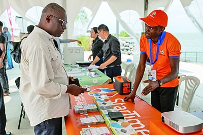2025年中国-加蓬商品展览会7月24日在加蓬首都利伯维尔开幕,来自中加两国的50余家企业参展。图为当地顾客在中企四达时代的展台咨询产品。新华社发