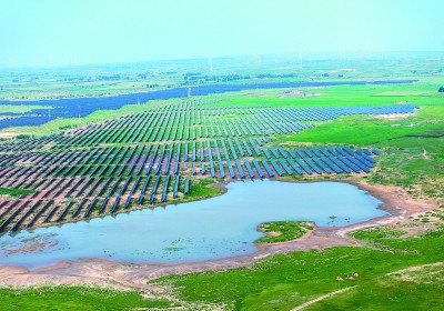 近年来,陕西省榆林市定边县充分利用光照、风力资源禀赋,大力发展光伏、风电等清洁能源产业,实现经济效益与生态保护双赢。图为8月3日,定边县白泥井镇,草原、湖泊、光伏、风电构成一幅生态画卷。周修建摄/光明图片
