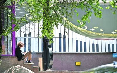 正值夏日,哈萨克斯坦阿拉木图绿意盎然,景色宜人。图为8月3日,一名男子在一家商店门前休闲。新华社记者 李任滋摄