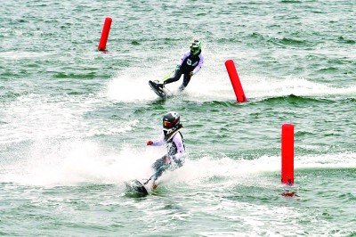 8月4日,为期两天的2025年全国动力冲浪板“奔跑吧·少年”U系列比赛(烟台站)在山东省烟台市芝罘区幸福湾水域开赛,来自全国各地的17支代表队63名运动员在3组别6个项目中展开激烈角逐。图为8月4日,选手在比赛中。 孙文潭摄/光明图片