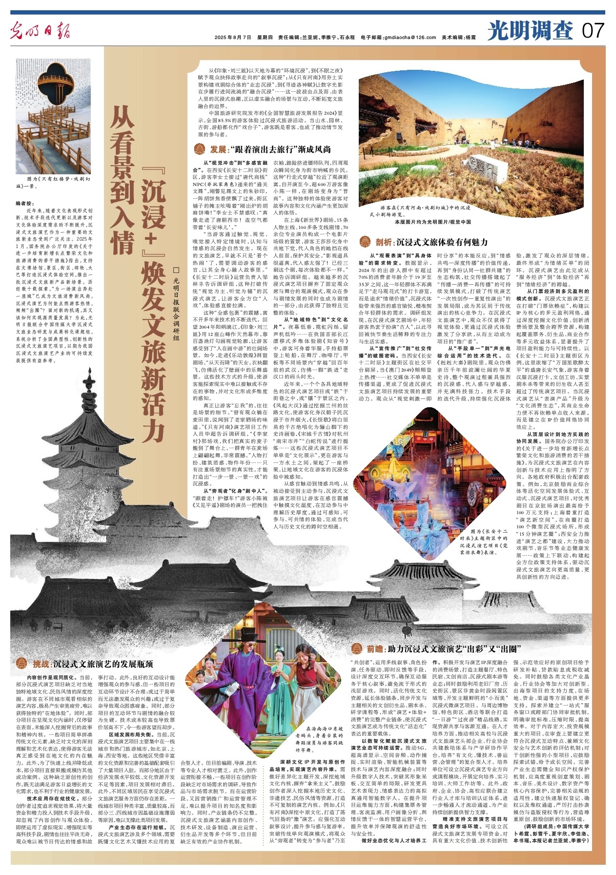 近年来,随着文化表现形式创新、技术手段迭代更新以及游客对文化体验深度需求的不断提升,沉浸式文旅演艺作为一种重要的文旅新业态受到广泛关注。2025年1月,国务院办公厅印发的《关于进一步培育新增长点繁荣文化和旅游消费的若干措施》指出,支持在文博场馆、景区、街区、邮轮、大巴等打造沉浸式体验空间,推出一批沉浸式文旅新产品新场景。历经数十载探索,“为一场演出奔赴一座城”已成为文旅消费新风尚。沉浸式演艺为何能点燃游客热情,频频“出圈”?面对新的机遇,其又该如何实现高质量发展?为此,光明日报联合中国传媒大学沉浸式文旅业态研发与成果转化课题组,系统分析了全国典型性、创新性的沉浸式文旅演艺项目,以期为我国沉浸式文旅演艺产业的可持续发展提供有益参考。