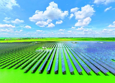8月4日,江苏宿迁泗洪县魏营镇先锋水库风光宜人,成片光伏与珍珠养殖浮漂相映成趣。王松竹摄/光明图片