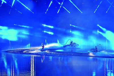 中国滑水运动员以滑水的方式疾驰于秦皇湖上,共同点燃主火炬。本报记者 陈城摄/光明图片