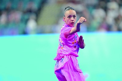 女子长拳决赛现场,外国运动员展示中国武术的魅力。本报记者 陈城摄/光明图片