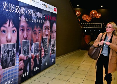 当地时间8月7日,电影《南京照相馆》在澳大利亚上映。图为8月8日,一名观众观看悉尼一家电影院内放置的《南京照相馆》海报。 新华社发
