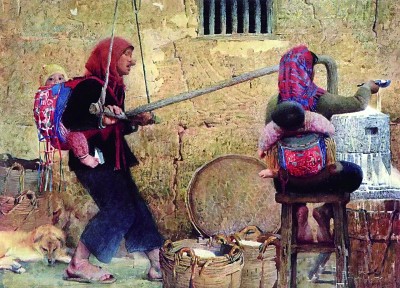 撒盐法即在湿润的色块上撒上少许盐粒,待其充分吸收周围的水分,便会形成类似雪花的肌理。试看张洪亮的《寨》,为了营造梦幻的意境,画家于作画过程中在场景边缘撒上了盐粒,随着无数疏密有致的白点缓缓晕开,整幅画面也被赋予了童话般的色彩。