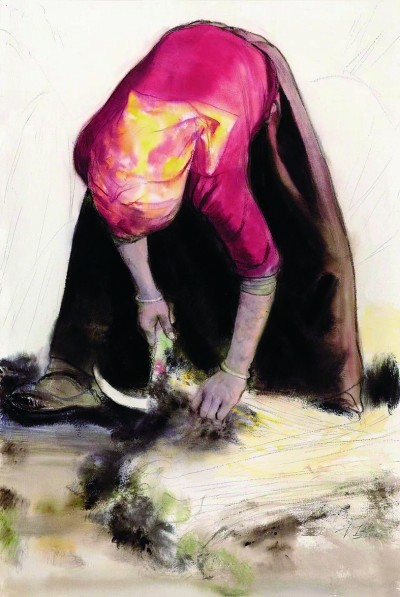 除了描绘自然景观,湿画法还被广泛应用于塑造拥有光滑质感的物象,如丝绸、金属、玻璃等。在应金飞的《逆光的肖像》中,女性人物的丝质衬衣呈现出柔和的光感,这样的光感一方面来自衣纹暗部与亮部的明度对比,另一方面则借助湿画法带来的柔和过渡,凸显了布料的柔软与光滑。而在陈坚的《收割》(图②)中,少数民族妇女的上衣同样以湿画法描绘,不同的是,画家采用了质地较粗的水彩纸,并巧妙借助纸面的肌理塑造出颗粒感,使衣服面料呈现出似绸又似纱的质感。可见,画家在创作中并非仅仅依赖技法本身,还需凭借经验与巧思,灵活调动各类材料的特性,最终实现质感的精准表现。