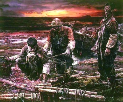 值得一提的是,在创作实践中,画家们也常常将湿画法与干画法进行有机结合,充分发挥二者优势,使画面刚柔相济,虚实相生。如刘永健的《尘土人生》聚焦了矿工作业的场景,画面前景人物的皮肤主要以湿画法塑造,衣饰主要以干画法刻画;背景下方布满锈迹的机械以干画法营造出硬朗、斑驳的质感,上方的天空则以湿画法绘就,通透润泽,仿佛刚下过一场解暑的大雨,为富有力量感的画面增添了一丝浪漫的气息,刚与柔的对比展现出强烈的艺术张力。