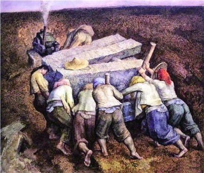 胶合剂混合法是在创作中加入胶合剂、上光剂等材料,使画面产生有别于传统水彩画的质感。如黄增炎的《同心协力》(图⑤)描绘了一群正在忙碌的劳动者,画家大胆创新,在水彩纸上以丙烯颜料做底,再于其上层层涂覆加入了胶合剂的水彩颜料。在叠加的过程中,颜料中的水分缓缓蒸发,画面呈现出颗粒质感,最终营造出沧桑厚重的氛围。