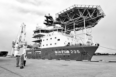 8月8日,在文莱摩拉港码头,工作人员站在“海洋石油295”船前。当日,由中国自主设计建造的多功能特种作业船——“海洋石油295”船首次来到文莱参与项目作业。新华社发