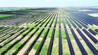 走进磴口县乌兰布和沙漠东北部新能源基地200万千瓦先导工程项目园区,一排排光伏矩阵整齐排列,仿佛为沙漠披上一层深蓝色盔甲。磴口县光照充足,年光照时长3300小时以上。当地利用得天独厚的风、光、热条件,推进风电光伏与防沙治沙一体化。“项目利用沙漠和荒漠化土地4.71万亩,5月建成投产,采用‘板上发电、板间种植、板下修复’模式,中间空地栽植梭梭、四翅滨藜等沙生灌木。”磴口县发展改革委副主任罗彪治边走边介绍,“预计每年产生绿电34亿度,年产值7.68亿元,园区绿化面积由5%提高至85%。”