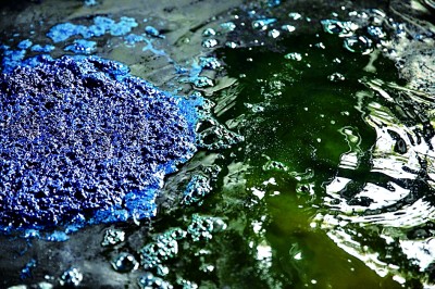 靛染的基本原理,是先萃取新鲜蓝叶中的靛蓝色素,再将靛青色素用还原法进行染色。这项1500年前的工艺,采用高浓度的色靛(而非植物)进行染色,从制靛到染色的每一道工序都极为复杂,但靛青染料可长期保存,同时又打破了产地限制、压缩了运输体积,由此带来的青靛商贸经济延绵数千年,传承至今。今天北京比较有名的蓝靛厂,就是明清时出产供朝廷使用的青蓝色染料的基地。
