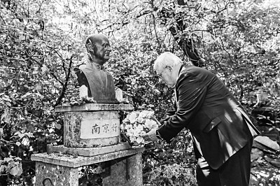 约翰·拉贝交流中心作为研究珍贵历史资料、举办展览和文化交流等活动的场所,旨在弘扬约翰·拉贝的人道主义精神。约翰·拉贝在华期间写下的日记是南京大屠杀最重要、最翔实的史料之一。图为8月7日,在德国海德堡约翰·拉贝交流中心内,托马斯·拉贝在约翰·拉贝雕像前摆放鲜花。新华社发