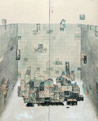 与之相比,何振华在其作品《移山》(图①)中则置换了传统山水的“经营位置”和西方焦点透视的空间组合,将多样化的传统山水笔墨语言进行移动与融合,展现出多重体验对单一视觉形象的延展。作品旨在探讨当代视角下山水画空间的呈现方式,以及对经典范式在多元文化背景下的存在境遇的反思。