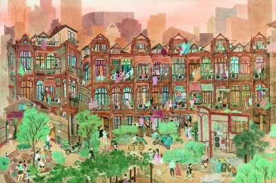 如周隽的《上海屋檐下之二》(图②)描绘了上海虹口区昆山花园路的老洋房。这些公寓经过精心修缮保留了年代感,整个社区的设计则兼顾了时尚感及与老公寓的协调性,使老建筑持续焕发着生机。创作者曾多次走访社区,收集居民的生活点滴,她将作品设定为一个夏日黄昏,通过工笔手法将笼罩在橘色光影下的老楼和普通人的日常生活一一呈现。艺术家持续关注历史建筑在当下的处境,乐见老建筑融入人们的日常生活并展现出独特的城市性格。此幅作品读之使人产生共鸣,更成为时代生活的生动记录。