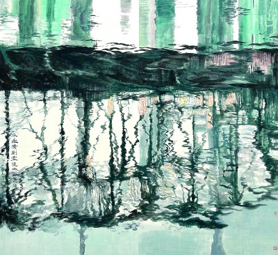 鲍莺的《隔之三》同样强化了笔触的复数性特征,密集的墨点叠加在一起,表现出柏油路面的质感,既丰富又单纯。同时,她利用水渍形成的痕迹,在画面上造就了许多偶然的效果,与理性的笔触排列形成反差,为画面增添了抽象的美感。史晨曦的作品《城市倒影》(图⑥)则抽离了重复性的理性因素,将传统笔墨与纯感性的表现主义手法相结合,通过水之倒影表现个人心绪,具有印象派绘画般的灵动效果。画家们在基于各自视角的前提下,通过表现城市山水主题,对传统笔墨作出了别具个性的解读。