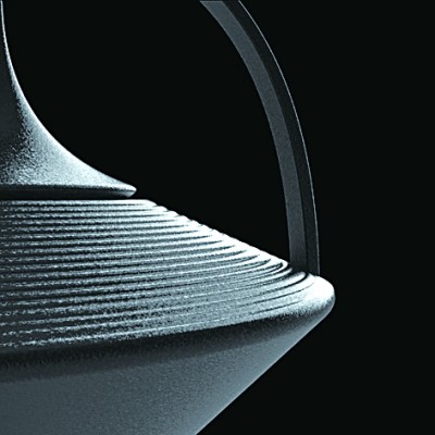 该茶壶为紫砂材质,在制作时,设计师希望其造型兼顾“时间”与“水滴”的双重意象。从侧面观看,圆弧形提梁的顶端处设计了向下延伸的尖角,在实用层面,这一结构使抓握茶壶更为方便、稳固;在审美层面,尖角与下方的圆锥形壶盖形成形断意连的呼应关系,仿若沙漏一般,象征着时间的流逝。同时,这一造型又似水滴滴落后溅起的水花,为作品带来灵动之气。从顶面俯视,壶身上半部分特别设计了分布均匀的环形纹路,仿若荡漾于水面的一圈圈涟漪,此时,弧形提梁又可看作悬于水面的一轮圆月,营造出宁静而深远的意境。