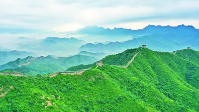 8月18日清晨,北京市密云区古北口镇司马台长城,蜿蜒于翠绿的山峰之上,雄伟壮丽。