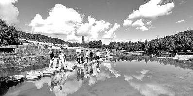 8月17日,位于云南省红河哈尼族彝族自治州弥勒市锦屏山风景区脚下的五彩云池,碧水蓝天,倒影林立,吸引游人观光游览。普佳勇摄/光明图片