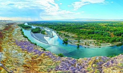 近日,新疆阿勒泰布尔津县五彩滩,蜿蜒河流与雅丹地貌相映成趣,景色壮丽。