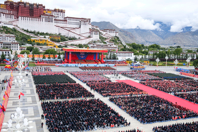 8月21日上午,西藏各族各界干部群众约2万人欢聚拉萨市布达拉宫广场,热烈庆祝西藏自治区成立60周年。这是庆祝大会现场。新华社发(索朗旺久摄)