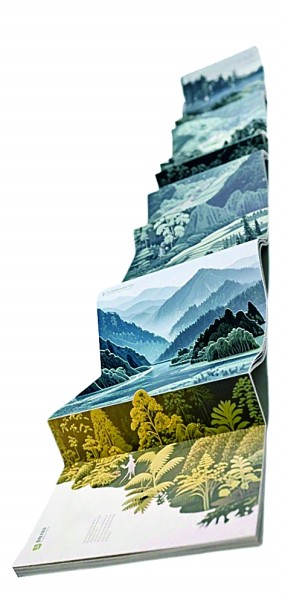 《南岭本草垂直记》是一本介绍南岭地区药用植物分布的艺术书,其最大的设计亮点是巧妙融合了当地特有的自然风貌。该书的装帧以丹霞地貌为灵感来源,书脊采用赭红色调,与岩层的天然色泽相呼应;书口以渐变坡面设计模拟山势的起伏变化;内页则采用超长连续折页,营造出丰富的层次感。同时,设计师精心挑选了不同材质与色彩的纸张,以区分不同海拔高度的自然环境,黄绿色调晕染低丘地带的玉竹群落,冷翠色调表现中段的当归分布区,蓝灰色调则模拟了峰顶石斛的生长环境。翻阅此书,一幅可观、可感的南岭自然生态长卷仿佛徐徐展开,给人以身临其境的阅读体验。