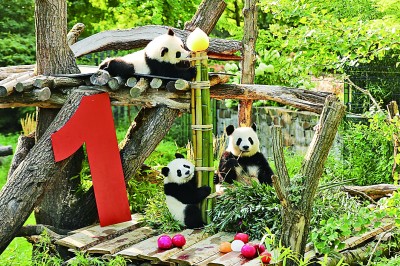 在德国出生的第二对大熊猫双胞胎“梦好”和“梦甜”8月22日迎来一岁生日。图为22日在德国柏林动物园拍摄的大熊猫“梦好”(上)、“梦甜”(左下)和母亲“梦梦”。新华社发