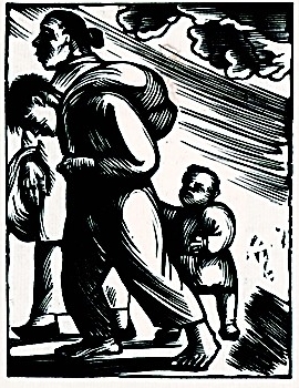 本书分为四个单元。“举国之殇”单元聚焦民族最深重的苦难:流离失所的难民蜷缩在废墟之间,饥寒交迫的妇孺沿街乞食,被奴役的同胞在铁蹄下挣扎求生……每一道遒劲的刻痕都浸透着血泪,那些战火中的流亡、劫后的荒芜、穷途的绝望,木刻特有的肌理表现化为震撼人心的视觉控诉,个体苦难反映着整个民族的集体创伤。