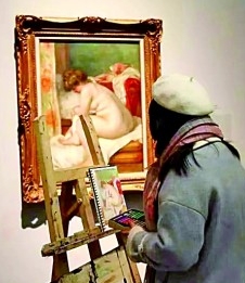 清华大学美术学院学生在“西方绘画500年”展览现场临摹作品。清华大学艺术博物馆供图