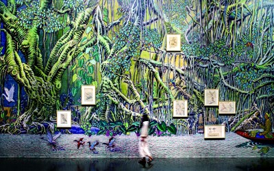 繁茂的森林、灵动的飞鸟、鲜艳的花朵……步入一层展厅,映入眼帘的是我国现代工笔重彩、陶艺与现代壁画的开拓者祝大年先生以其细腻笔法描绘的诗意之境。包括1979年首都机场壁画《森林之歌》全套手稿在内的90余件作品,抒广大,叙精微,表达着对自然生命深沉而炽热的礼赞。观众纷纷驻足,在志愿者的讲解下,用心聆听这首自然之诗中的生命律动。“好展览是会说话的,这就是榜样的力量”,鲁晓波说,清华大学艺术博物馆非常重视学院文脉的研究,对老一辈艺术家的收藏与学术整理还在持续推进。
