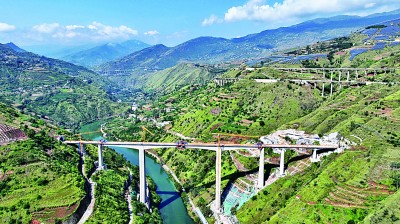 9月7日,在云南省昭通市鲁甸县江底镇,渝昆高铁江底牛栏江特大桥实现全桥合龙。大桥的合龙标志着桥隧占比高达87.4%的渝昆高铁建设取得关键性突破,为全线按期建成通车奠定了坚实基础。图为当日拍摄的合龙现场。新华社发