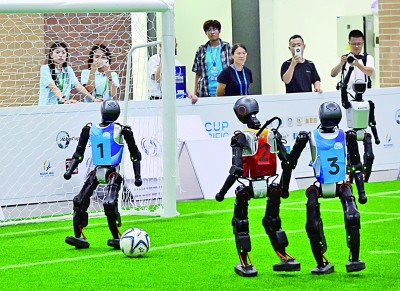 9月6日至9日,2025亚太机器人世界杯青岛国际邀请赛在青岛世界博览城国际展览中心举行。其中,人形机器人足球赛吸引了众多观众前来观赛。图为9月8日,机器人在足球比赛中。新华社发