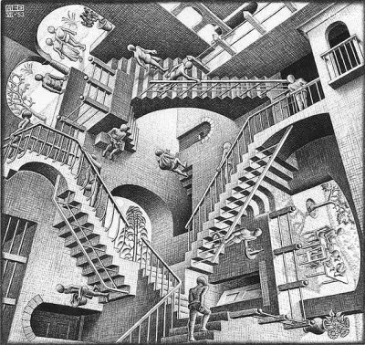 我们不禁追问,这些充满了迷惑性和矛盾性的图形究竟是如何发生的呢?其机巧在于,观看者在面对这些错觉主义图像的时候,产生了视觉上的误判。这是一个较为复杂的认知心理学话题,贡布里希将其描述为“观看者的本分”。简单来说,当艺术家将观看者置于这个令人眼花缭乱的图形王国,日常生活中的“上下左右”等概念都失去了意义,“我们是在力图理解画家意欲表达的这些事物和景色关系的过程中,认识到他的安排的荒谬之处”。艺术家就是这个视觉迷宫的缔造者,正如埃舍尔自己所说的那样,“绘画就是欺骗”。