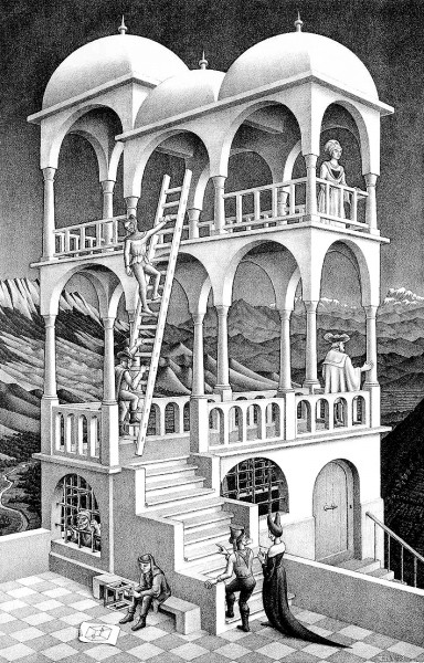 终其一生,埃舍尔都在拓展视知觉的外延,探索平面表达的可能性,建构在三维空间内无法实现的“不可能结构”。他创作了大量违背现实空间透视关系和逻辑关系的图形,在二维画面中创造了“不可能”的三维世界:“我的作品通常是顽皮灵动的。我实在抑制不住要嘲弄一切所谓不可动摇的确定性,比如故意将二维和三维、平面和空间混淆,或者拿重力来开个玩笑,这都是非常有趣的。”这类作品大致包含两种表现形式:一种是在二维画面中同时出现多种不同的透视关系,以此表现透视的多维性,如《巴别塔》(1928)、《阶梯宫》(1951)等;另一种是在二维画面中制造在现实世界中不可能存在的矛盾图形,如《高与低》(1947)、《凸与凹》(1955)等。