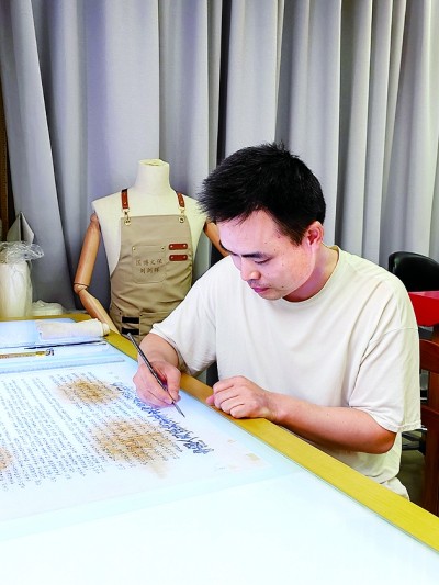 复原性复制还有一道重要的工序:将复制出的“完好”品做残做旧,将文物原件的残损样貌与旧气还原出来,再现其历史流转中形成的沧桑感。“经过这样复原性复制的文献,不光具有史料价值,还具有工艺价值。”刘剑辉说。