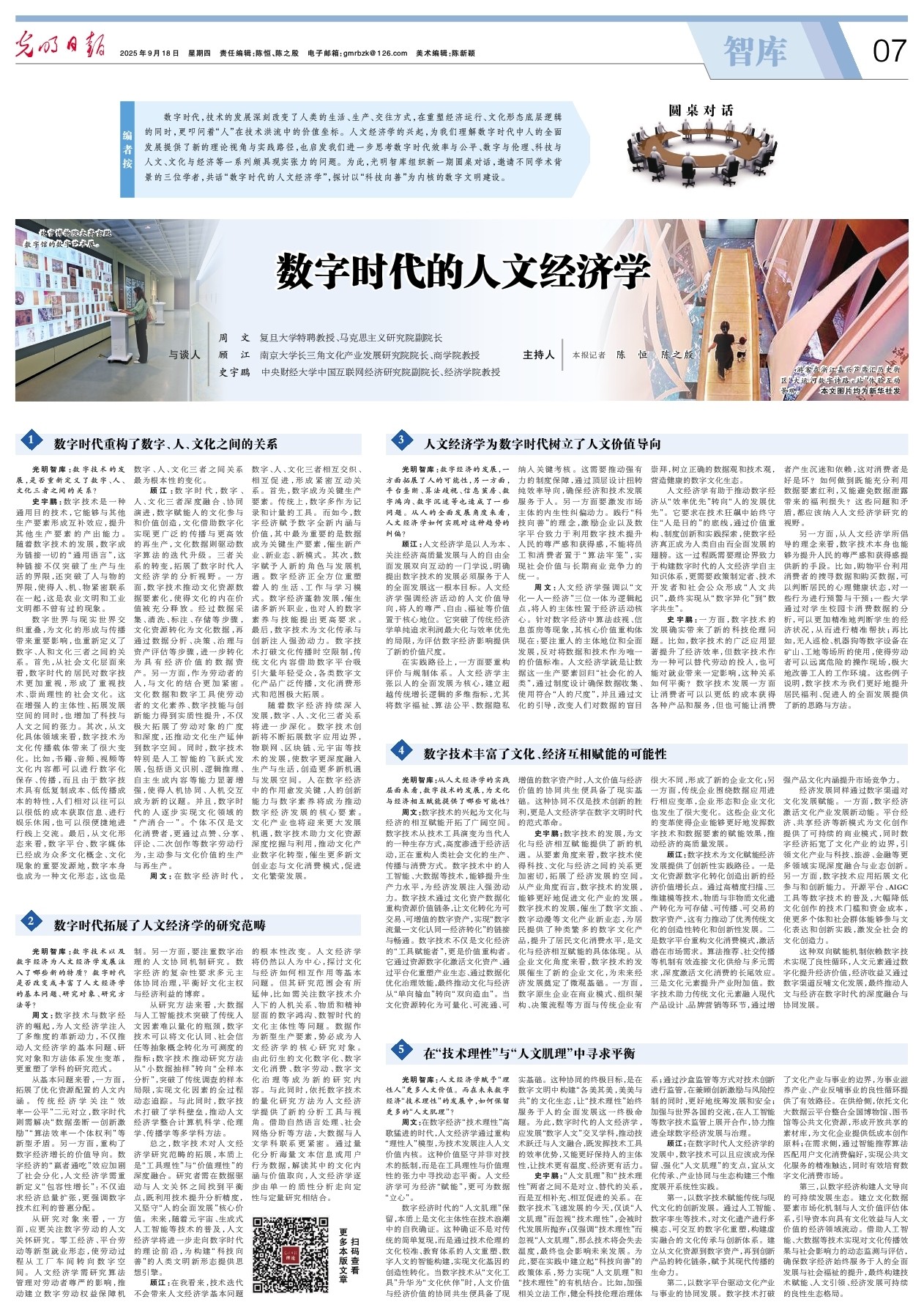 数字时代,技术的发展深刻改变了人类的生活、生产、交往方式,在重塑经济运行、文化形态底层逻辑的同时,更叩问着“人”在技术洪流中的价值坐标。人文经济学的兴起,为我们理解数字时代中人的全面发展提供了新的理论视角与实践路径,也启发我们进一步思考数字时代效率与公平、数字与伦理、科技与人文、文化与经济等一系列颇具现实张力的问题。为此,光明智库组织新一期圆桌对话,邀请不同学术背景的三位学者,共话“数字时代的人文经济学”,探讨以“科技向善”为内核的数字文明建设。