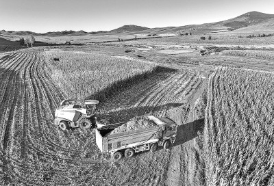 9月的科尔沁草原,秋意渐浓。在内蒙古通辽市扎鲁特旗巨日合镇,农牧民抢抓农时,忙着收获青贮玉米,为牲畜过冬储备饲草料。图为9月18日,在通辽市扎鲁特旗巨日合镇,农机在田间收割青贮玉米。 新华社记者 连振摄