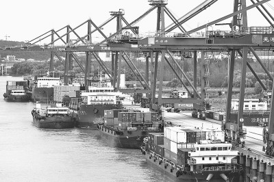 9月18日,在安徽省芜湖港朱家桥港区国际集装箱码头,货车往来穿梭,船舶停靠在泊位上有序装卸集装箱,一派繁忙景象。