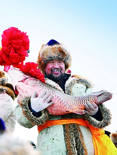 在位于新疆阿勒泰地区福海县的乌伦古湖,“渔把头”展示冬捕的头鱼。本报记者 孙金行摄/光明图片