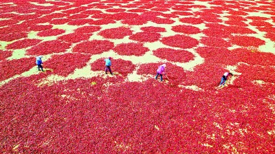 9月20日,甘肃省酒泉市肃州区三墩镇,村民在晾晒辣椒。火红的辣椒如同给大地铺上红色地毯,十分壮观。曹红祖摄/光明图片