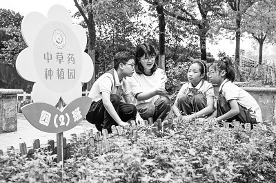 9月23日,在安徽省合肥市庐阳区五一小学“百草园”内,学生们正在中医药老师的指导下学习种植中草药,了解中草药功效知识。今年以来,五一小学积极开展“中医药伴我成长”等校园活动,让学生学习中医药知识,传承中医药文化。赵明摄/光明图片