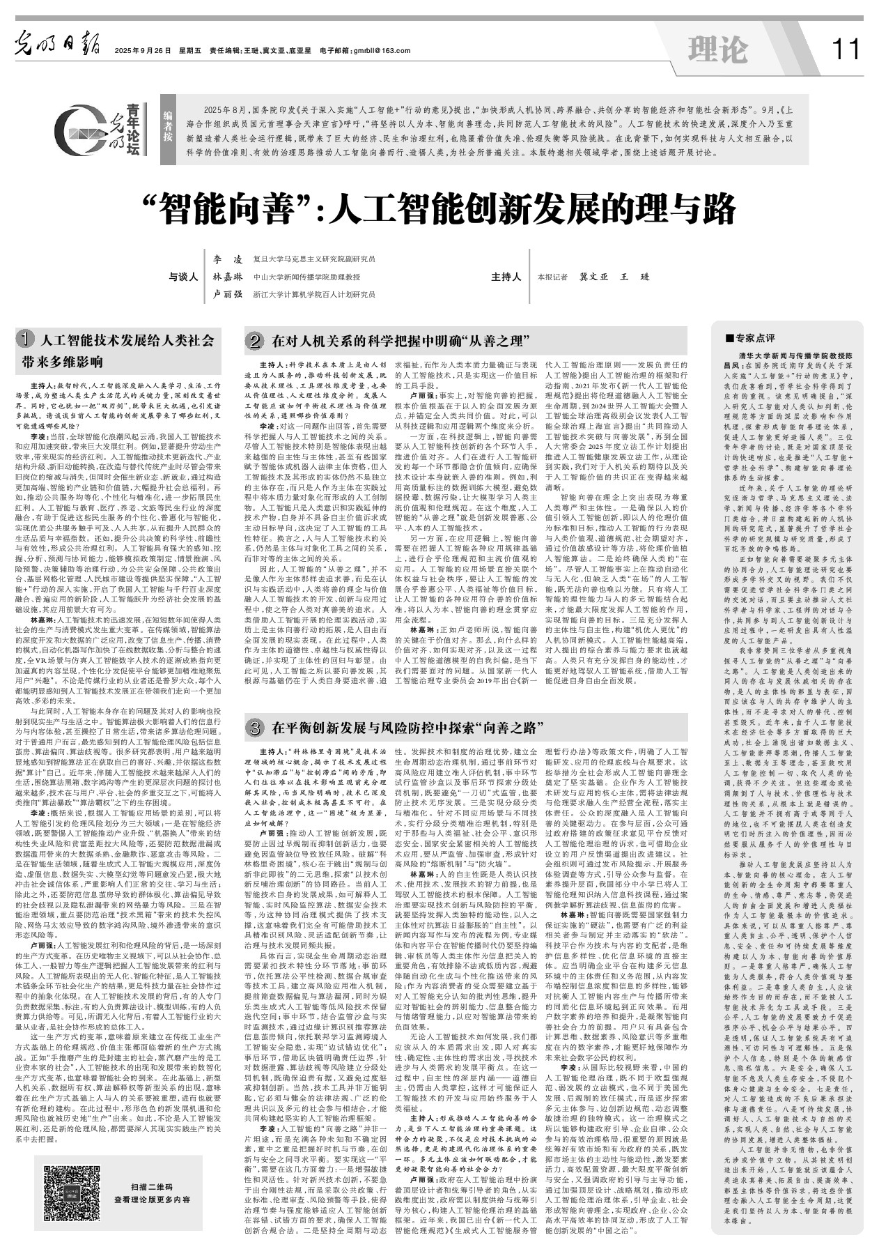 2025年8月,国务院印发《关于深入实施“人工智能+”行动的意见》提出,“加快形成人机协同、跨界融合、共创分享的智能经济和智能社会新形态”。9月,《上海合作组织成员国元首理事会天津宣言》呼吁,“将坚持以人为本、智能向善理念,共同防范人工智能技术的风险”。人工智能技术的快速发展,深度介入乃至重新塑造着人类社会运行逻辑,既带来了巨大的经济、民生和治理红利,也隐匿着价值失准、伦理失衡等风险挑战。在此背景下,如何实现科技与人文相互融合,以科学的价值准则、有效的治理思路推动人工智能向善而行、造福人类,为社会所普遍关注。本版特邀相关领域学者,围绕上述话题开展讨论。