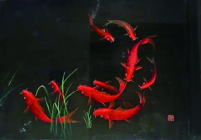 重庆市工艺美术大师刘淑珍从事漆艺创作50余年,她试图将高堆漆装饰技法进一步拓展,为作品带来更加丰富立体的表现。其漆画作品《鲤鱼》描绘了一群鱼儿在水中畅游的灵动场景。在塑造鱼身时,刘淑珍巧妙运用高堆漆装饰技法营造出不同部位的厚度变化,鱼尾和鱼鳍则不堆漆,使得从鱼身到鱼尾的触感由高至低、平滑顺畅。堆漆步骤完成后,再对鲤鱼的眼、须、鳞等进行装饰,待完全干燥后即可全面罩漆并研磨推光。画面中,鲤鱼整体造型丰满圆润,层次丰富,彰显出含蓄清雅的东方韵味。
