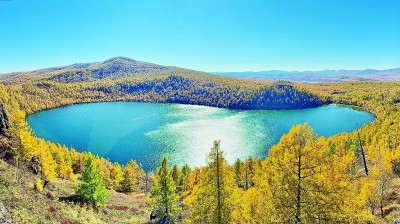 当下,内蒙古阿尔山国家森林公园秋意正浓,驼峰岭天池,漫山金黄、池水碧蓝,尽显秋色。本报记者 王旭东摄/光明图片