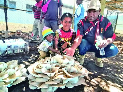 图为9月29日,在巴布亚新几内亚东高地省首府戈罗卡市,当地民众参观中国援巴布亚新几内亚菌草旱稻项目永久性示范基地种植的大平菇。 新华社发