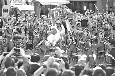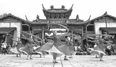 10月1日,演员在江苏省句容市宝华山国家森林公园为游客表演节目。 新华社发