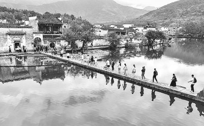 10月1日,游客在安徽省黟县宏村游玩。新华社记者 杜宇摄