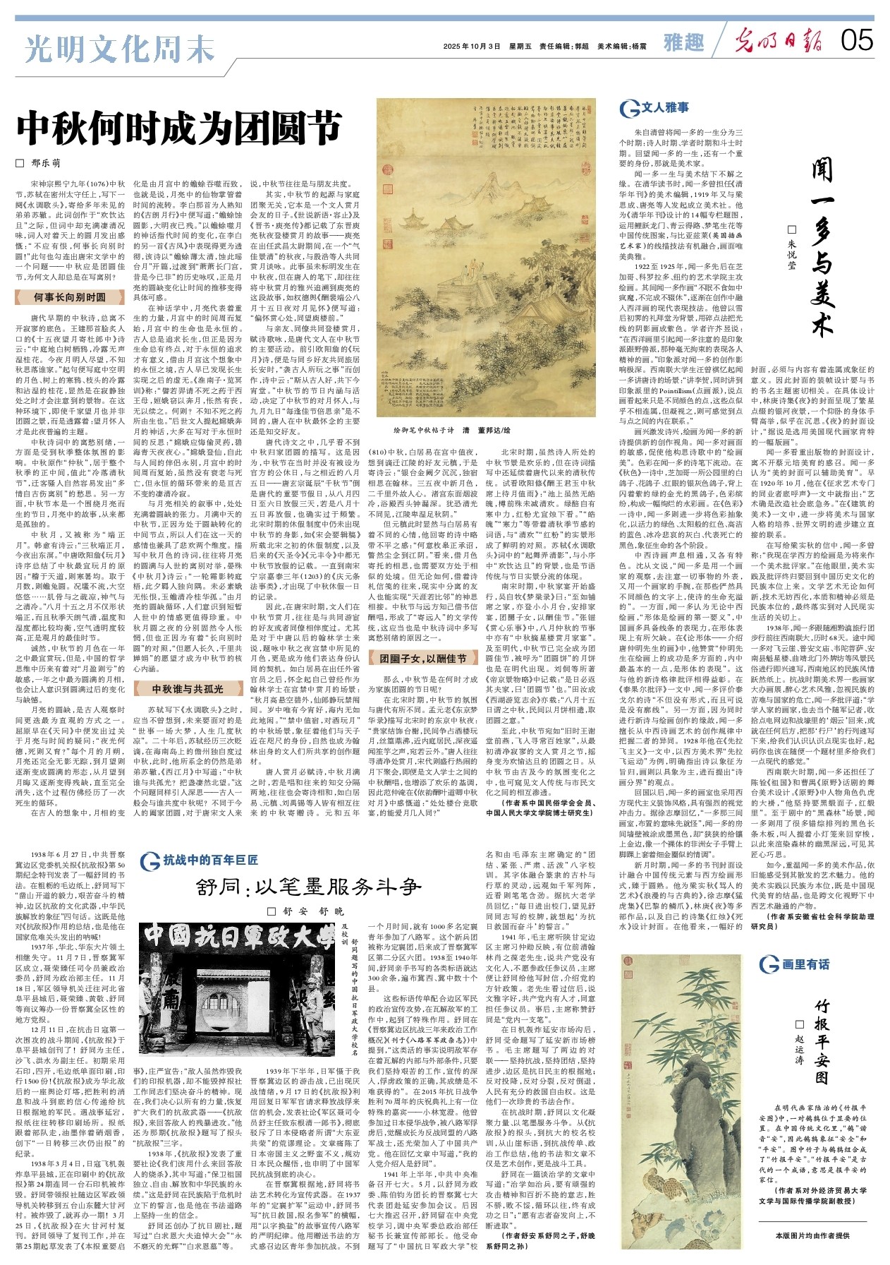 至此,中秋节宛如“旧时王谢堂前燕,飞入寻常百姓家”,从最初清净寂寥的文人赏月之节,摇身变为欢愉达旦的团圆之日。从中秋节由古及今的氛围变化之中,也可窥见文人传统与市民文化之间的相互渗透。