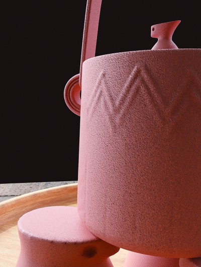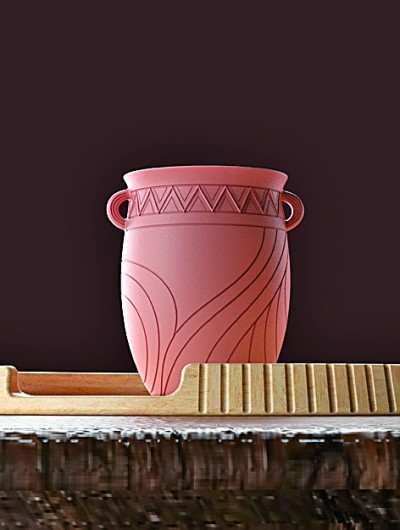 陶盂及支座是烹煮用具,陶盂为圆桶形容器,以简约的三角纹作装饰,其造型借鉴了出土于河北武安磁山村的“红陶盂”。为了使用更为便捷,设计师在器物两侧添加了盂耳,并进行镂孔处理,加装曲线柔和的提梁构件。同时,陶盂顶盖上以圆雕技法塑造鸟首形盖钮,与陶盂下方成鼎足之势的鸟首形支座相互呼应,其造型灵感源自磁山文化陶器“乳钉绳纹鸟首形陶支脚”。设计师特意将鸟首造型进行了简化处理,顶部的平面让陶盂的放置更加稳固,硬朗的轮廓线条使作品彰显出现代艺术美感。